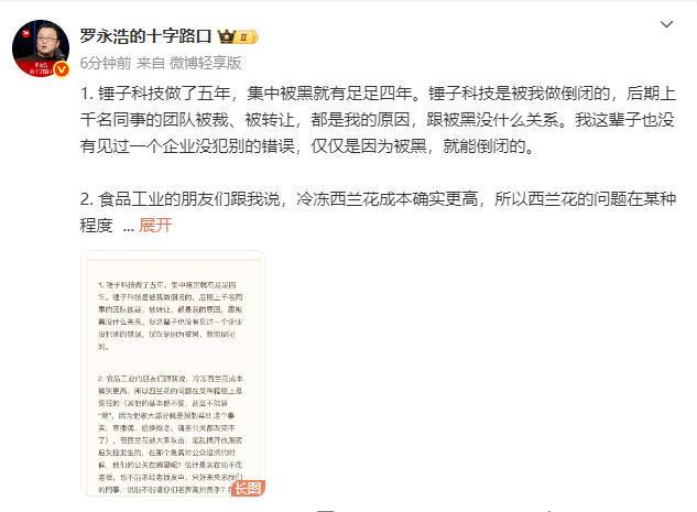 罗永浩称:锤子科技做了五年,集中被黑就有足足四年。锤子科技是被我做倒闭的,后期上千名同事的团队被裁、被转让,都是我的原因,跟被黑没什么关系。我这辈子也没有见过一个企业没犯别的错误,仅仅是因为被黑,就能倒闭的。